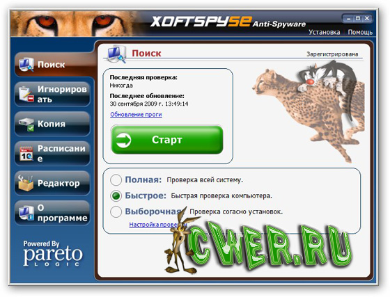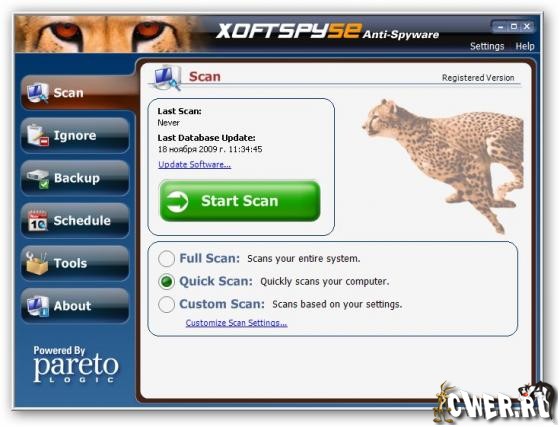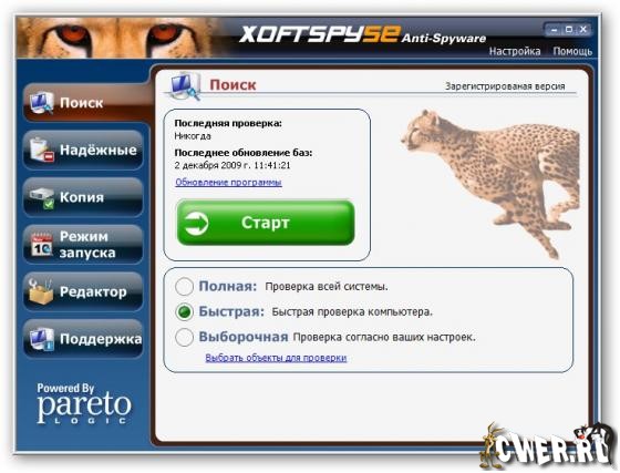 XoftSpySE Anti-Spyware - одна из лучших для обнаружения и удаления шпионских и рекламных модулей. Программа XoftSpySE, которая сканирует оперативную память и разделы системного реестра, файлы и папки на предмет присутствия вредоносных программ, таких как: Adware, Spyware, W32/Spybot, Malware, Pop-up Generators, Keyloggers, Unwanted Toolbars, CWS, Trojans, Browser Hijackers, Backdoors, BHOs и др. В настройках сканирования можно указать, какой тип шпионского программного обеспечения необходимо искать на компьютере, а также ограничить поиск указанными папками.