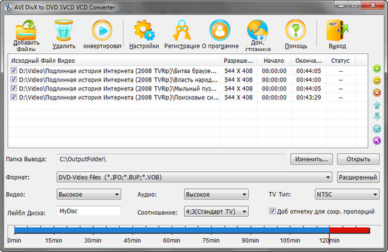 AVI DivX to DVD SVCD VCD Converter - конвертер видео файлов в DVD, SVCD, VCD форматы, поддержка AVI, DivX, XviD, MPEG4, MPEG1, MPEG2, WMV, ASF, DAT форматов, выбор и конвертирование между NTSC и PAL, поддержка m2v и mpa форматов, нарезка больших файлов на отрезки, выбор начала и конца файла по времени, поддержка пакетного режима работы.