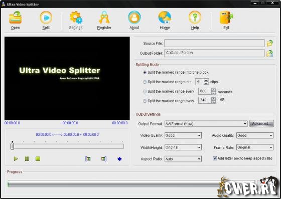 Мощная сервисная программа для разделения, обрезания (подрезки) больших AVI, DivX, Xvid, MPEG, WMV, ASF, RM, MOV, 3GP или MP4 файлов на маленькие клипы в различных форматах. Встроенный видео проигрыватель и различные режимы разделения позволят вам с легкостью разделить или обрезать видео файл на маленькие клипы.Вы можете даже использовать данную программу для конвертирования отдельного файла. К выходным форматам относятся AVI, MPEG I/II, VCD, SVCD, DVD, WMV. Все кодировщики/кодеки уже встроены и любое преобразование может быть сделано после запуска программы. Данная программа не требует каких-либо дополнительных технических навыков и очень проста в использовании.