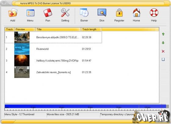 Aurora MPEG To DVD Burner - программа, предназначенная для записи AVI, MPEG файлов на диски DVD-R, DVD+R, DVD+RW, DVD-RW. Программа может создавать структуру DVD диска и записывать полноценные диски с меню. Для меню можно выбирать различные текстовые эффекты, фон, разметку. Диски не обязательно записывать сразу же – вы можете скомпоновать DVD и сохранить его в виде образа ISO или во временные папки на жестком диске. Программа имеет понятный пользовательский интерфейс и не вызовет каких-либо проблем при использовании.