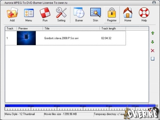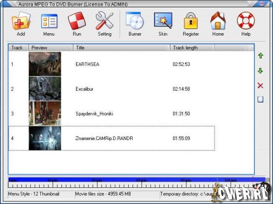 Aurora MPEG To DVD Burner - программа, предназначенная для записи AVI, MPEG файлов на диски DVD-R, DVD+R, DVD+RW, DVD-RW. Программа может создавать структуру DVD диска и записывать полноценные диски с меню. Для меню можно выбирать различные текстовые эффекты, фон, разметку. Диски не обязательно записывать сразу же – вы можете скомпоновать DVD и сохранить его в виде образа ISO или во временные папки на жестком диске. Программа имеет понятный пользовательский интерфейс и не вызовет каких-либо проблем при использовании. Все что вам будет нужно сделать - это добавить видео-файлы в программу, отредактировать меню, выбрать дисковод, на котором будет записываться диск и нажать кнопку прожига. В случае, если диск полный, его можно будет стереть и после чего уже записать видео на чистый диск.