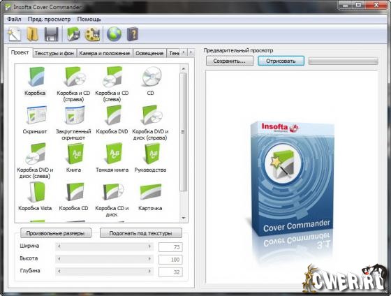 Insofta Cover Commander позволяет создавать профессиональные виртуальные коробки, книги, DVD-коробки, руководства, CD-диски, скриншоты. Всего несколько щелчков мыши все что нужно для выполнения этой работы. Исчерпывающие настройки освещения, камеры, тени, отражения позволяют вам создать изображение любого уровня сложности и увидеть готовый результат в реальном времени в окне предпросмотра. Мастер создания нового проекта выполнит всю "грязную" работу за вас, так что вы сможете сосредоточиться на содержании вашего проекта.