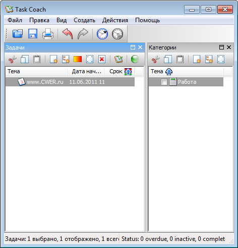 Task Coach - это программа-органайзер для записи текущих дел на самые разнообразные темы, которую можно бесплатно скачать на cwer.ws. Возможно построение древовидной структуры дел, отображение списком и многое другое. Очень проста в использовании, имеет русский интерфейс. Программа появилась в результате неудовлетворенности доступными ныне менеджерами задач, например Outlook или Lotus Notes, которые не обладают инструментами для создания сложных задач. Часто задачи или важные дела состоят из нескольких действий. Task Coach способен составлять сложные задачи.