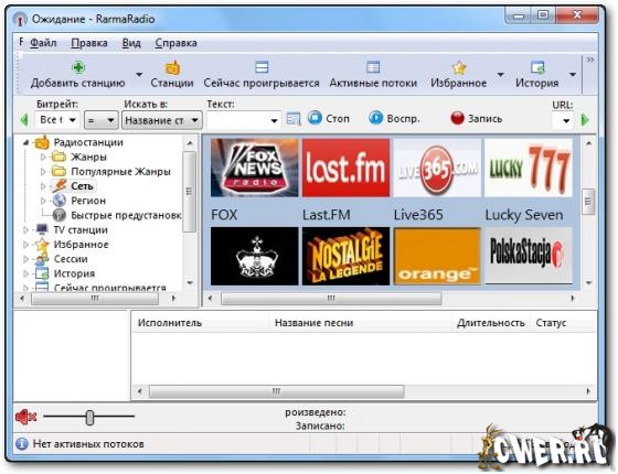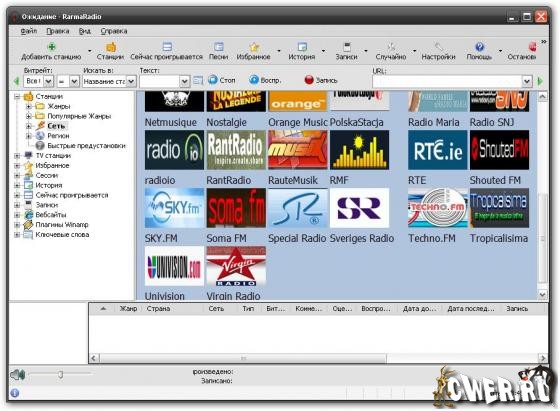 RarmaRadio - программа для прослушивания и записи интернет-радиостанций. Обладает большим набором возможностей, обеспечивая комфортное прослушивание радиостанций и удобную запись транслируемых данных. Программа содержит множество станций рассортированных на группы в зависимости от жанра музыки, битрейта, сети и региона, имеет функцию поиска станций, автоматически скачивает из Интернета информацию о проигрываемых песнях, включая альбомную графику, и поддерживает подключение плагинов медиаплеера Winamp. С помощью RarmaRadio можно слушая одну станцию, одновременно записывать несколько других интернет-радиостанций, осуществлять запись интернет-вещания по расписанию, а также автоматически начинать запись, в случае если заиграла определенная композиция. При сохранении полученных аудио файлов RarmaRadio добавляет в них теги.