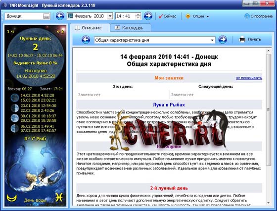 Дает характеристику дня, лунный гороскоп человека, настроение, рекомендации по здоровью, уходу за телом, сельскому хозяйству, дням для бракосочетания. Позволяет производить поиск искомой фазы в пределах 200 лет. Может сворачиваться в значок в системной панели. Есть возможность добавлять заметки на календарные дни.
