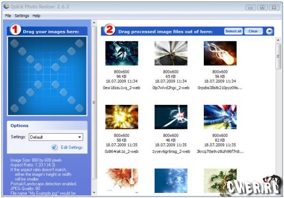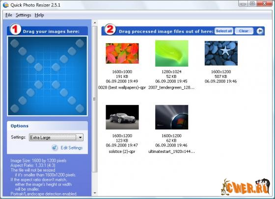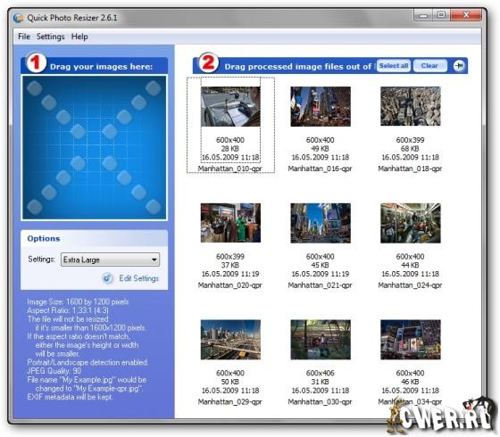 Quick Photo Resizer - легкая в использовании утилита для быстрого и удобного изменения размеров изображений перед выкладыванием их где-либо, например, в интернете. Программа позволяет выбирать схемы изменения размера изображений, перетаскивать необходимые фотографии в окно программы, после чего вы быстро сможете увидеть результат. В программе имеется возможность сохранения нескольких схем, после чего вы сможете просто выбирать их для изменения размеров очередной партии изображений. Программа может автоматически выбирать качество и уровень сжатия JPEG изображения, в зависимости от размера, который вы указали в настройках. Кроме того, в программе имеется возможность добавления собственных графических водяных знаков, например, с логотипом вашей компании или сайта. Программа легка в использовании и обладает простым пользовательским интерфейсом.