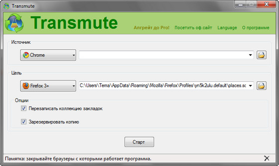 Transmute экспортирует закладки из одного браузера в другой, поэтому разбираться с их настройками не придется. С помощью Transmute закладки передаются из одной версии Firefox в другую (поддерживается как 2, так и 3), в Internet Explorer, Google Chrome и Opera. Нужно лишь выбрать исходный и целевой браузеры, и программа автоматически определит расположение закладок в каждом из них. А затем нажать на кнопку Export. При необходимости, Transmute переименует целевую папку и добавит к названию временную метку, что пригодится при создании резервных копий.