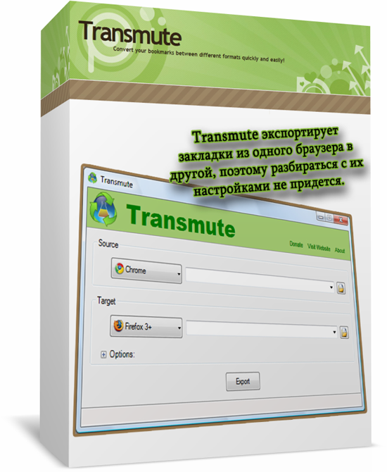 Эта программа экспортирует закладки из одного браузера в другой, поэтому разбираться с их настройками не придется. С помощью Transmute закладки передаются из одной версии Firefox в другую (поддерживается как 2, так и 3), в Internet Explorer, Google Chrome и Opera.