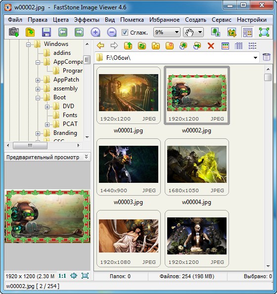 FastStone Image Viewer позволяет просматривать, изменять и конвертировать графические файлы. Программа имеет поддержку всех популярных форматов графики, в том числе JPEG, JPEG 2000, GIF, PNG, PCX, TIFF, WMF, BMP, ICO, RAW и TGA. Простой и удобный внешний вид сочетает в себе большое количество полезных возможностей. Также имеется поддержка пакетного изменение размеров и имен картинок, удаление фрагментов, замена цветов, использование водяных знаков. Есть возможность создавать слайд-шоу со множеством разнообразных эффектов, поддержка сканеров. Кроме прочего, программа может делать скриншоты любой части экрана.