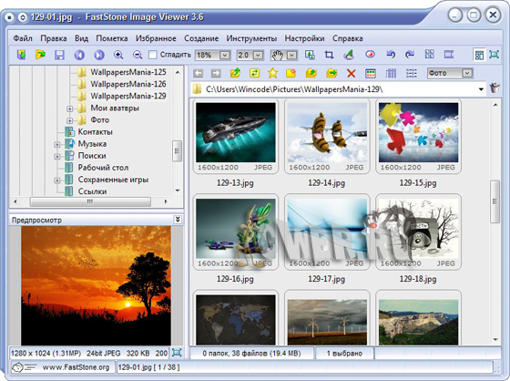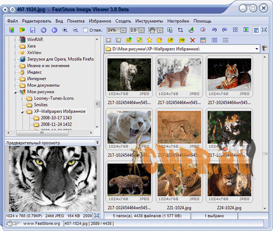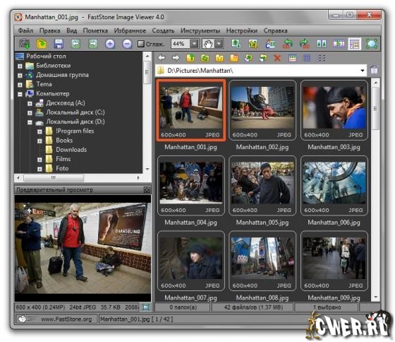 FastStone Image Viewer - вьювер, редактор и конвертор графических файлов. Поддерживает все популярные форматы графики, включая JPEG, JPEG 2000, GIF, PNG, PCX, TIFF, WMF, BMP, ICO, RAW и TGA. Обладает простым и удобными интерфейсом, сочетая его с большим количеством полезных возможностей. Поддерживается пакетное изменение размеров и переименование картинок, удаление ненужных фрагментов, подгонка и изменение цветов, установка водяных знаков и т.д. и т.п. Имеется возможность создавать слайдшоу с более чем 150 эффектами перехода и фоновой музыкой, присутствует различные графические эффекты, ZOOM, полноэкранный режим, поддержка работы со сканером и т.д. Кроме всего этого, программа умеет делать скриншоты экрана, причем как экрана целиком, так и любой его части.