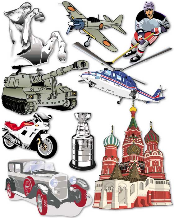 В клипарт вошли следующие тематики: Африка, авиация, животные, стрелки-указатели, Азия, награды, птицы, рамки, строения, календари, карты, графики, цирк, компьютеры, кресты, стоматология, дизайн, образование, электроника, вероисповедание, фантазии, мода, рыба, флаги, цветы, правительства, гороскопы, индустрия, насекомые, эмблемы, Латинская Америка, досуг, письма, карты стран и континентов, медицина, ретро, деньги, музыка, цифры, офис, люди, фабрики, поп-арт, портреты, постеры, проекты, рептилии, наука, вещи, космос, спорт, оборудование и инструмент, транспорт, путешествия, оружие и т.д. и т.п. (всего 75 тематик).