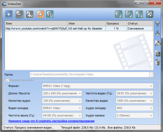 VideoGet - программа для скачивания видео клипов с больше чем 250+ видео веб-сайтов (YouTube, Yahoo Video, MySpace, VSocial, Metacafe, и много-много других). Многие из этих веб-сайтов держат видео в FLV формате, и большинство людей не знает как проигрывать эти файлы, VideoGet позволит вам конвертировать все видео в множество популярных форматов для более комфортного проигрывания. VideoGet поддерживает AVI, MPEG1, MPEG2, WMV, FLV, MP4, 3GP, MP3 форматы, так что вы имеете возможность не только посмотреть видео на своем компьютере, но и переписать его на свой iPod, мобильный телефон или любой другой портативный прибор. Кроме того вы самостоятельно можете задавать настройки конвертации.