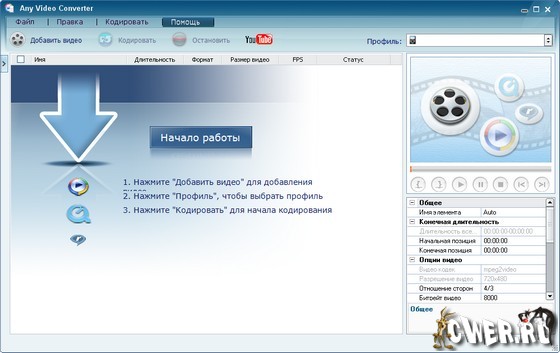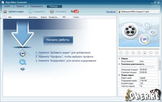 Программа для конвертирования видео файлов. Any Video Converter позволяет перекодировать популярные видео форматы (AVI, MOV, RM, MPEG, DVD, WMV, MP4 и FLV) в DVD, VCD, MP4 или FLV. В утилите присутствует возможность использовать для кодирования файлов как готовые профили с установленными параметрами видео, которые ориентированы на определенные устройства (бытовой DVD-проигрыватель, мобильный телефон), так и самостоятельно подбирать свои настройки конвертирования. Перед началом кодирования видео, его можно просмотреть во встроенном проигрывателе. В программе есть функция конвертирования только выбранного участка видео файла, для чего во встроенном плеере достаточно указать начало и конец нужного отрезка.