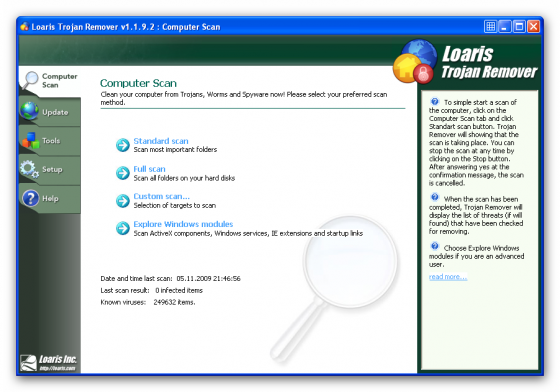Loaris Trojan Remover средство удаления вредоносных программ: трояны, черви, рекламные и шпионские программы - когда стандартное программное антивирусное обеспечение или не в состоянии обнаружить их, или не в состоянии фактически удалить их. Стандартная антивирусная программа хороша в обнаружении вредоносных программ, но не всегда справляется с их удалением. Trojan Remover проектируется особо для удаления этих программ без необходимости ручного их удаления.
