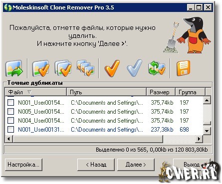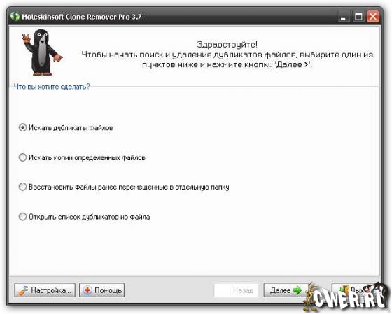 Clone Remover Pro - программа для поиска дубликатов файлов. Поможет найти одинаковые файлы, находящиеся в разных «местах» (жестких дисках, CD, DVD и т.д.) вашего компьютера, даже если названия файлов не совпадают. Поиск дубликатов файлов в этой программе осуществляется двумя нажатиями кнопок, т.к. программа очень проста в использовании и не требует особых навыков работы с компьютером. Если, что-то будет не понятно, вы сможете воспользоваться системой помощи, встроенной в программу. Даже ради интереса, знать сколько одинаковых файлов скопилось у вас на носителях информации - очень полезно.