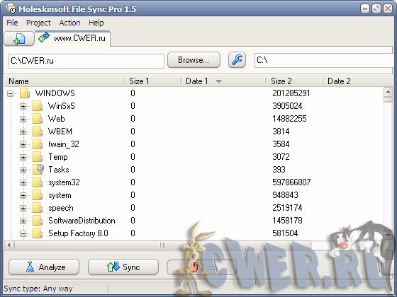 File Sync Pro - простая в использовании программа для синхронизации файлов и папок. С помощью этой утилиты вы сможете определять различия между двумя папками, синхронизировать папки и файлы, к примеру, между вашим ПК и ноутбуком, компьютером и сетью, а также копировать только те файлы, которых еще нет на вашем компьютере с другого ПК на флэшку. Благодаря данной программе вы будете точно знать разницу между двумя копиями одной и той же папки и, при необходимости, заменить старые файлы на новые. Синхронизация папок и файлов с помощью этой программы будет проста для вас, как два клика мышью. Кроме того, программа обладает небольшим размером дистрибутива и быстрой работой.