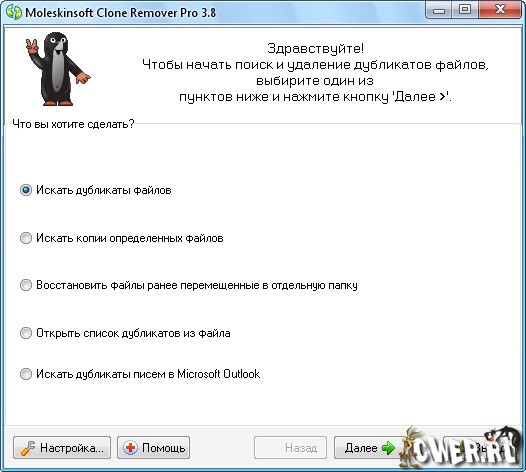 SWMole Clone Remover Pro - программа для поиска дубликатов файлов, копий определенных файлов, писем в Microsoft Outlook и восстановления файлов, ранее перемещенных в отдельную папку. Помогает вам найти одинаковые файлы в разных местах (жестких дисках, CD, DVD и т.д.) на компьютере, даже если названия файлов не совпадают.