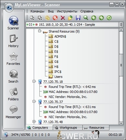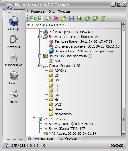 MyLanViewer - программа для сканирования и мониторинга компьютеров в сети, с возможностью поиска общедоступных файлов в их общих ресурсах. Она показывает компьютеры в удобном для просмотра виде, который содержит имя компьютера, IP адрес, MAC адрес, общие ресурсы и другие детали для каждого компьютера. С помощью её вы можете следить за компьютерами в сети и получать оповещение, когда состояние одного из них изменится.