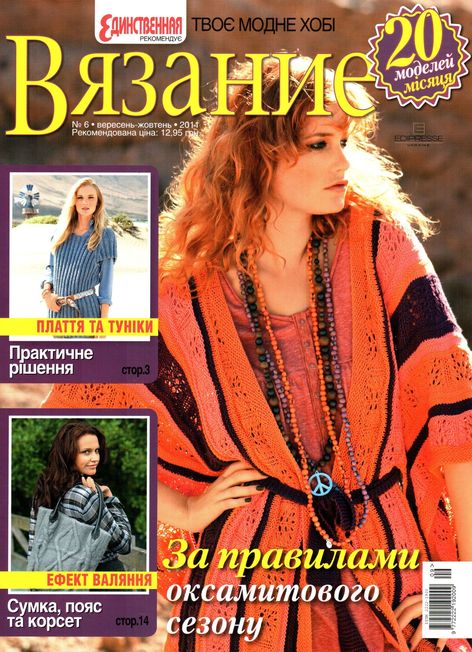 Украинский журнал по вязанию с подробными схемами и описанием 20 моделей от лучших европейских дизайнеров. Кофточки, джемпера, пуловеры, платья, болеро, корсет, пальто, сумка – все интересное и оригинальное, актуальных цветов и из модной пряжи.