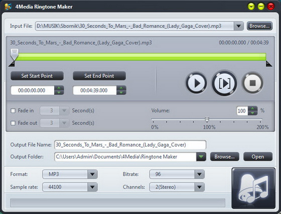 4Media Ringtone Maker – программа, для создания рингтонов в формате MP3, m4r, WAV, AMR, M4A и OGG практически для всех типов мобильных телефонов, включая iPhone. Программа позволяет создавать рингтоны из всех популярных видео и аудио форматов, включая AVI, MPEG, WMV, DivX, MP4, H.264/AVC, AVCHD, MKV, RM, MOV, XviD, 3GP, WMA, WAV, RA, M4A , MP3...