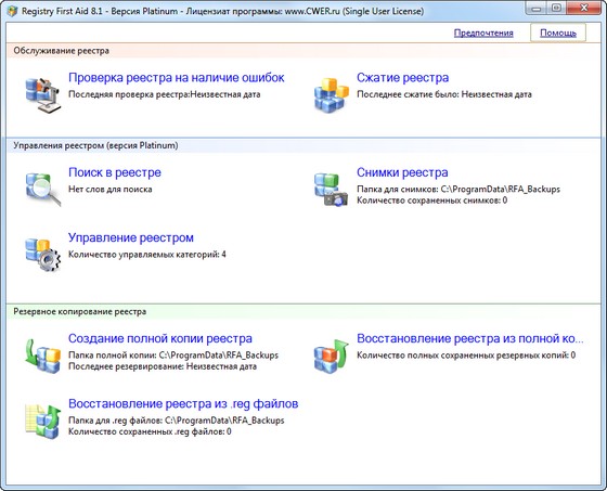 Registry First Aid Platinum - сканирует реестр на предмет испорченных или ненужных записей (оставшихся после удаления программ), тем самым обеспечивает более быструю работу компьютера и предотвращает сбои. Программа автоматически просматривает системный реестр и обнаруживает неверные ключи, которые вы сможете исправить или удалить. Также утилита производит поиск записей и сравнение их с файлами на диске, и, если найдена запись, соответствующая файлу, который был перемещен в другую папку, то программа скорректирует эту запись в реестре. Программа имеет опцию резервного копирования и восстановления реестра на случай, если система даст сбой, мультиязычный интерфейс, включая русский.