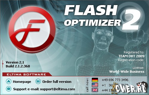 Eltima Flash Optimizer – удобное программное решение для веб-мастеров, веб-дизайнеров, Flash-профессионалов и всех кто когда-либо сталкивался с технологией Adobe Flash. Он позволяет уменьшить размер SWF файла на 60-70% благодаря алгоритмам векторов, образов, морфинга, Z-буфера, шрифтов и другой оптимизации. Flash Optimizer уменьшает размер не только какой-либо отдельной части Вашего Flash видеоролика, но и оптимизирует все его элементы (включая кривые, нулевые объекты, ZLib оптимизацию и др.).
