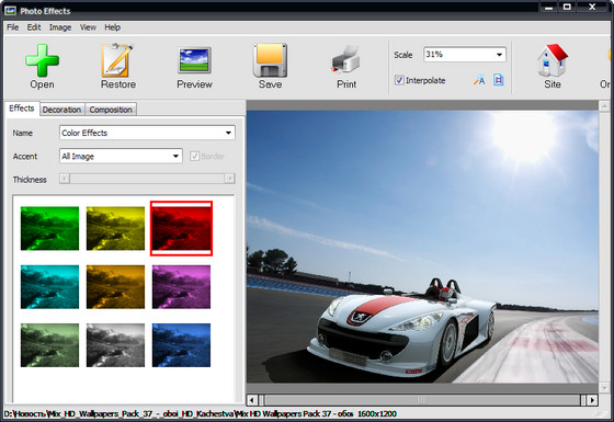 Photo Effects Studio - это новая программа для обработки фотографий при помощи разнообразных фильтров. С её помощью можно полностью преобразить любое изображение. Программа позволяет использовать более 50-ти эффектов, включая как традиционные, так и оригинальные. Вы сможете увидеть свои фотографии на фоне дождя и снега, в тумане и под облаками, добавить солнечный свет или закружить в потоке тайфуна.