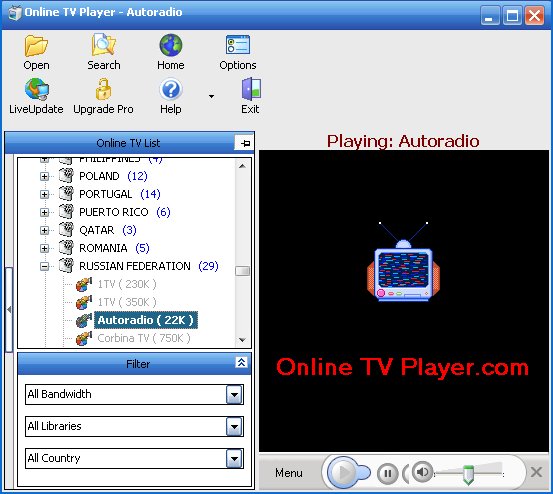 Online TV Player - бесплатный медиаплеер, который позволяет просматривать более 850 бесплатных Интернет-каналов и слушать более полутора тысяч онлайн-радиостанций на вашем ПК. Поддерживается работа как с Windows Media, так и с Real Video форматами, имеется опция просмотра в полноэкранном режиме. Среди других возможностей стоит отметить простоту использования Online TV Player, плюс возможность смены скинов.