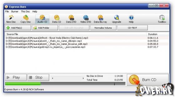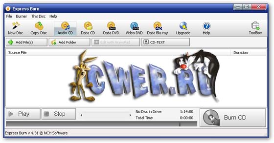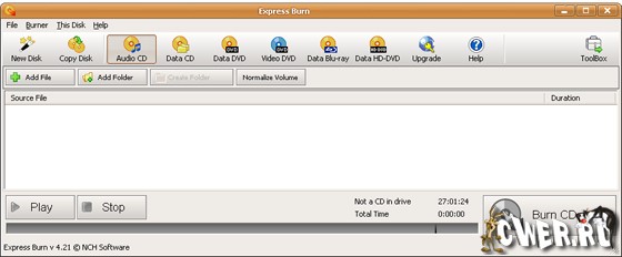 Express Burn - программа для записи данных на оптические носители (CD, DVD, DVD Blu-ray). В Express Burn реализованы возможности автоматической настройки скорости записи дисков и создания аудио-дисков без использования дополнительных кодеков, а также предусмотрены средства, необходимые для создания обложек записываемых дисков.