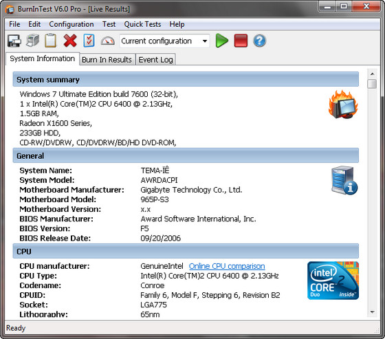 BurnInTest Professional - профессиональная версия программы для всестороннего и детального тестирования компонентов компьютера. Утилита тестирует скорость процессора, оперативную память, жесткие диски, CD/DVD приводы, звуковые карты, видеокарты, принтеры, сетевые соединения. BurnInTest Professional также может проводить тестирование последовательных (до 12 портов одновременно) и параллельных портов, портов USB (до 10 портов одновременно). Также в профессиональной версии имеются дополнительные параметры тестирования процессоров и видеокарт. После тестирования программа выдает отчет с найденными ошибками и нестабильностями. Идеально подходит для любителей разгона.