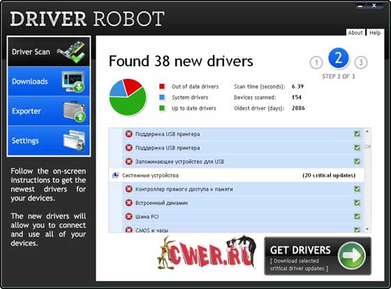 Driver Robot автоматически сканирует Ваш компьютер, выводит перечень устройств для которых не установлены драйвера или для которых программа нашла обновления. После просканировки Вашего компьютера на присутствие драйверов ко всем устройствам, она составит список устройств которые требуют установки драйверов и предложит их установить.