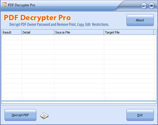 PDF Decrypter Pro предназначен для снятия мастер-пароля и ограничений на копирование, редактирование, печать и т.п. с PDF-файлов. PDF Decrypter Pro успешно расшифровывает PDF-файлы Adobe Acrobat версии до 9, даже со 128-битным или 256-битным шифрованием. Программное обеспечение является чрезвычайно простым в использовании инструментом для расшифровки пароля владельца и не требует установки Adobe Acrobat Reader. Расшифрованный файл может быть открыт в любом PDF Viewer (например, Adobe Acrobat Reader) без каких-либо ограничений, функции печати / копирования / редактирования включены.