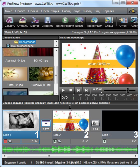 ProShow Producer – программа для профессионального создания презентаций от Photodex. Утилита поддерживает работу со слоями и дает возможность использовать неограниченное число слоев для каждого слайда. Программа поддерживает прозрачность для файлов PSD, PNG, TIFF и GIF, дает возможность использовать маски слоя, эффекты перехода, градиентную заливку или заливку цветом. Фотографии, из которых состоит презентация, можно редактировать, применяя к ним такие инструменты, как повышение четкости, изменение контрастности и насыщенности цветов.