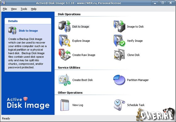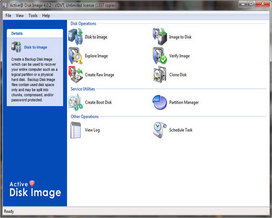 Active@ Disk Image - двухуровневый программный комплекс для резервного копирования содержимого диска под Windows - Backup Disk Image, или создания полного клона поверхности диска, каждого его сектора - Raw Disk Image, не для систем Windows. Легкий компонент программы Active @ Boot Disk (самозагружаемый CD/USB диск) поможет привести мертвую систему обратно в чувство, вернуть к жизни, т. е. восстановить систему Windows. Создаваемые программой образы/имиджи можно размещать практически на любых мобильных носителях: CD-R, CD-RW, DVD-R, DVD+R, DVD+RDL, USB и Fire Wire устройствах, локальных дисках, Sip, Jaz, HD DVD и Blu-ray дисках. Соответственно, присутствуют функции для такого вида программ, как возможность работы по расписанию и обозреватель содержимого - Disk Image Explorer. Имеет красивый интуитивно понятный интерфейс с пошаговым движением вперед.