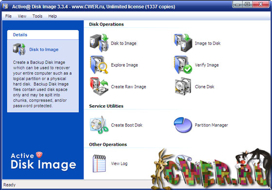 Программа Active@ Disk Image предназначена для создания и копирования образов жестких дисков. Это может быть полезно при копировании данных с компьютера на компьютер, а также в целях резервного копирования данных. Программа работает в чистом DOSe, то есть с загрузочной дискеты. Образ резервирования может быть сохранен на USB накопителе, сетевом хранилище, записан напрямую на CD/DVD/BR диски, или сохранено на других медиа носителях. Решение по резервированию данных для компьютера или любых компьютерных дисков, включая операционную систему, приложения и пользовательские файлы. В случае краха компьютера, резервный образ может использоваться для восстановления компьютерной системы или для поиска и восстановления любого нужного файла из образа.
