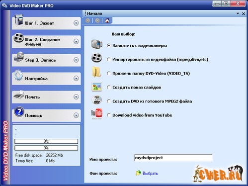 Video DVD Maker может создавать DVD на основе видеофайлов в форматах AVI, DIVX, XVID, MP4, MPG, WMV, ASF, MOV, а также выполнять захват видео с ТВ-тюнера, веб-камеры, DV-камеры и других устройств. Работа программы организована в виде пошагового мастера, и процесс создания диска разбит на три этапа: захват видео, добавление дополнительных файлов, запись DVD. Программа поддерживает запись на любые типы дисков, в том числе двухслойные DVD. Русский интерфейс присутствует.