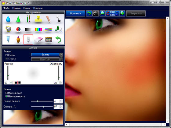 Photoinstrument- великолепный редактор для обработки цифровых фотографий, предназначенный в первую очередь для обработки портретных изображений. Photoinstrument предлагает громадное количество интуитивно понятных инструментов (удаление красных глаз, сглаживание морщин, увеличение чёткости, коррекция цвета и другое) для придания портрету "гламурного" качества.
