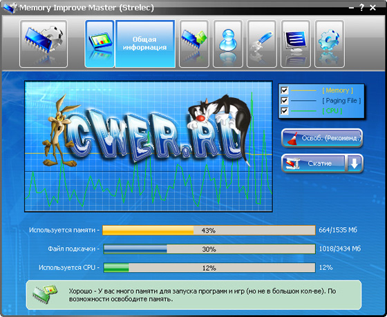 Memory Improve Master – позволяет увеличить быстродействие вашего компьютера за счет освобождения (дефрагментации) оперативной памяти. Имеется возможность установки минимального количество свободной оперативной памяти, при превышении которого запустится модуль и попытается удалить из оперативной памяти лишние процессы. Кроме этого, есть возможность просмотра запущенных процессов, наблюдение за нагрузкой на ЦП и множество других полезных настроек.