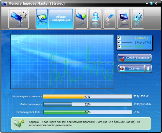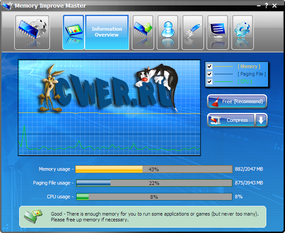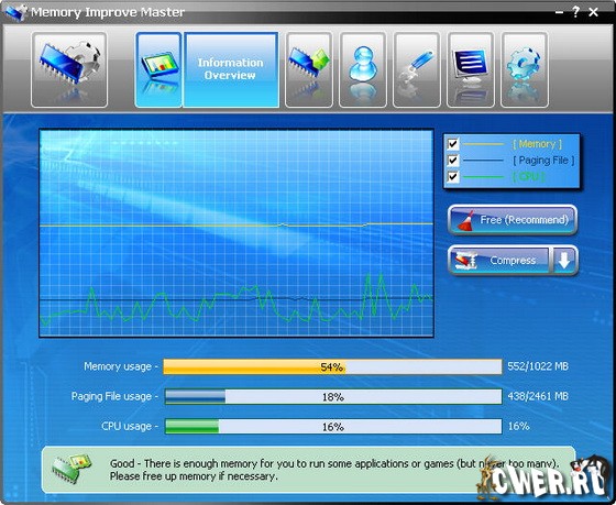 Memory Improve Master - позволяет увеличить быстродействие вашего компьютера за счет освобождения (дефрагментации) оперативной памяти. Имеется возможность установки минимального количества свободной оперативной памяти, при превышении которого запустится модуль и попытается удалить из оперативной памяти лишние процессы. Кроме этого, есть возможность просмотра запущенных процессов, наблюдение за нагрузкой на ЦП и множество других полезных настроек.