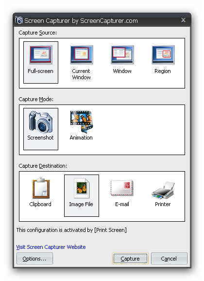Screen Capturer 1.0.4.42 - простой в использовании скринсэйвер, делает захват, печать и отправку скриншотов. Просто нажмите кнопку "PrtScr" (Print Screen) на клавиатуре и программа спросит, хотите ли вы захватть полный экран, активное окно приложения или область экрана. Выберите нужный режим захвата и нажмите кнопку "Capture"("Захват"), чтобы сохранить скриншот в буфер обмена, в файл или в приложение к электронной почтe.