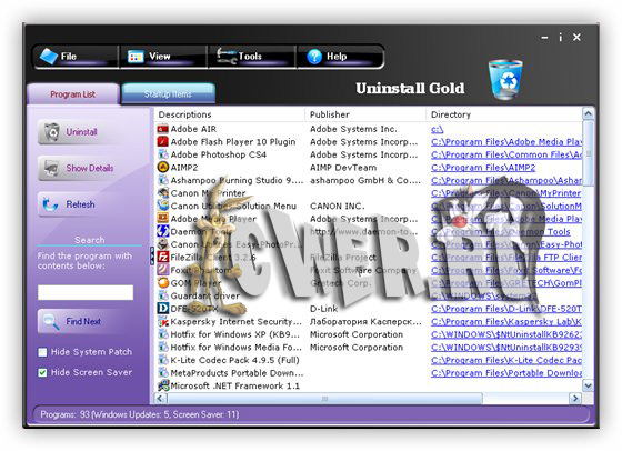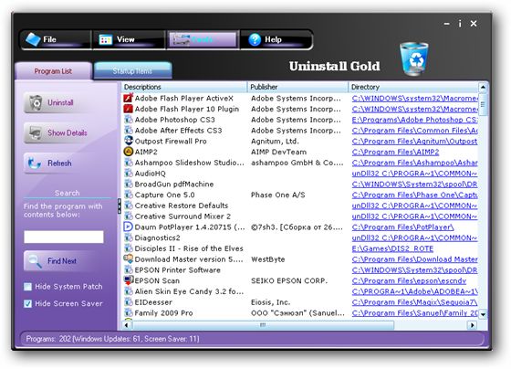 Uninstall Gold - программа для деинсталляции установленных ранее приложений. Программа обладает большим количеством функций: показывает скрытые установленные программы, сортирует список программного обеспечения по заданному фильтру, удаляет некорректно инсталлированные и деинсталлированные программы.