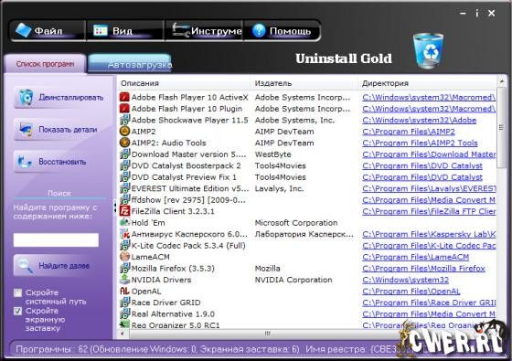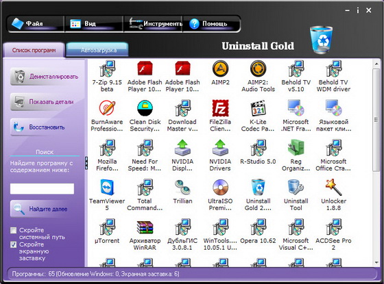 Uninstall Gold- программа для деинсталляции приложений, обладает большим количеством функций: показывает скрытые установленные программы, сортирует список программного обеспечения по заданному фильтру, удаляет некорректно инсталлированные и деинсталлированные программы.