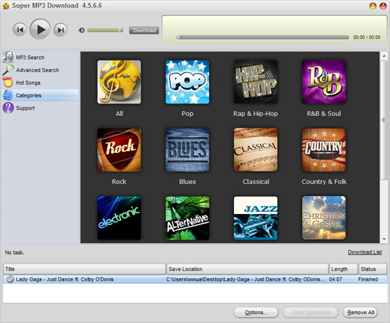 Super MP3 Download - прямой доступ к бесплатной музыке. Этот mp3 загрузчик надолго обеспечит Вас музыкальными композициями. В мире существуют тысячи групп и исполнителей, предлагающих свое творчество бесплатно. Шанс найти среди них что-нибудь по душе очень велик. Чтобы облегчить Ваш поиск, программа предложит топ сто недели и лучшее в четырнадцати жанрах. Вы сможете сначала прослушать мелодию и лишь потом сохранить её на жесткий диск.