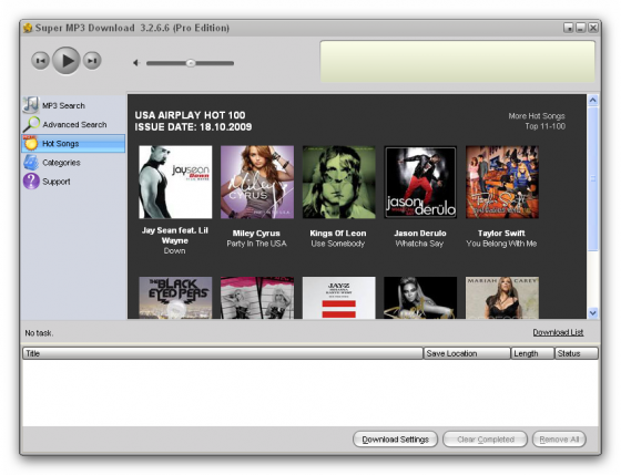 Super MP3 Download - это простая в использовании программа, которая позволяет быстро загрузить из более 100 млн. MP3 из крупнейших сетевых бесплатных ресурсов, а также прослушать музыку онлайн, прежде чем загрузить ее. Вы можете по результатам поиска решить, что скачать. Super Mp3 Download всегда приносит вам самые популярные песни в мире, он рекомендует вам хитов 100 Billboard каждую неделю, списки хитов по 14 категориям, от электро до религиозных, от хип-хопа до классики и т.д. Кроме того, Вы можете сделать расширенный поиск по исполнителю, названию, альбому, изданию.