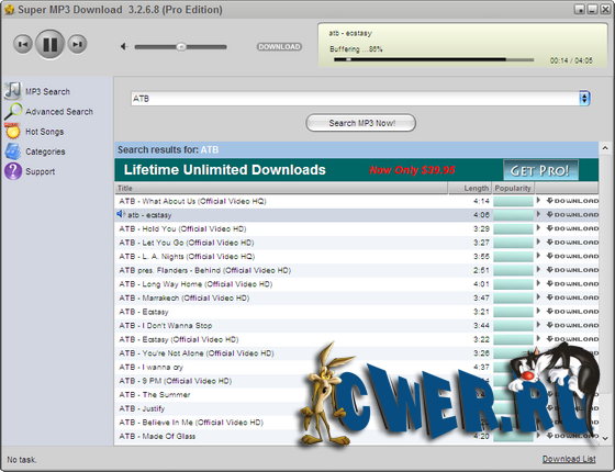 Super Mp3 Download Pro - прямой доступ к бесплатной музыке. Этот mp3 загрузчик надолго обеспечит Вас музыкальными композициями. В мире существуют тысячи групп и исполнителей, предлагающих свое творчество бесплатно. Шанс найти среди них что-нибудь по душе очень велик. Чтобы облегчить Ваш поиск, программа предложит топ сто недели и лучшее в четырнадцати жанрах. Вы сможете сначала прослушать мелодию и лишь потом сохранить её на жесткий диск.