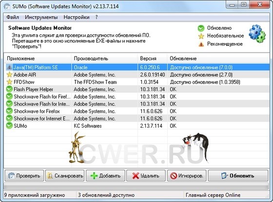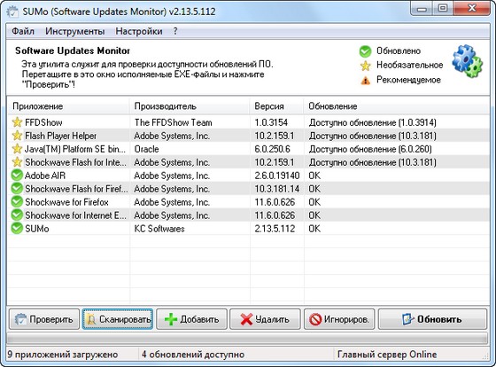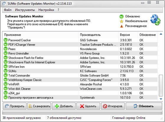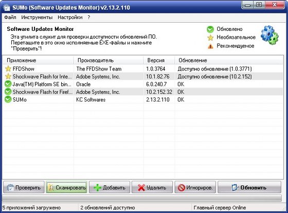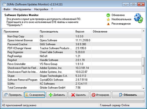 SUMo - утилита для отслеживания обновлений программного обеспечения, установленного на компьютере пользователя. Главная задача SUMo - уведомление о появлении новых версий приложений, с которыми вы работаете. Для проверки наличия обновления к той или иной программе, достаточно перетащить исполняемый файл программы в окно SUMo. В этом окне можно увидеть название приложения, номер версии, название компании-разработчика и информацию о наличии обновлений. SUMo удобна тем, что позволяет проверить наличие обновлений, не открывая при этом сами программы. С помощью SUMo можно проверять апдейты сразу для нескольких приложений, а затем выборочно загружать их.