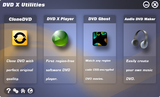 DVD X Utilities - набор разнообразных инструментов для работы с DVD фильмами. С помощью этого набора вы сможете без проблем копировать и просматривать защищенные DVD фильмы, а также снимать данную защиту, благодаря множеству инструментов, находящихся в данном наборе. В состав входит четыре программы такие, как CloneDVD, DVD X Player, DVD Ghost и Audio DVD Maker. Теперь вы с легкостью сможете копировать ваши DVD диски на компьютер или другие DVD. Сможете просматривать ваши фильмы с помощью DVD X Player, который позволяет смотреть даже защищенные DVD. А также, с помощью Audio DVD Maker, вы сможете записывать вашу музыкальную коллекцию на DVD диск или же извлекать звуковые фрагменты из видео. Программы имеют множество возможностей и обладают приятным и понятным пользовательским интерфейсом.