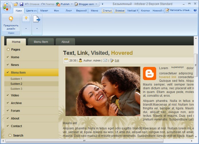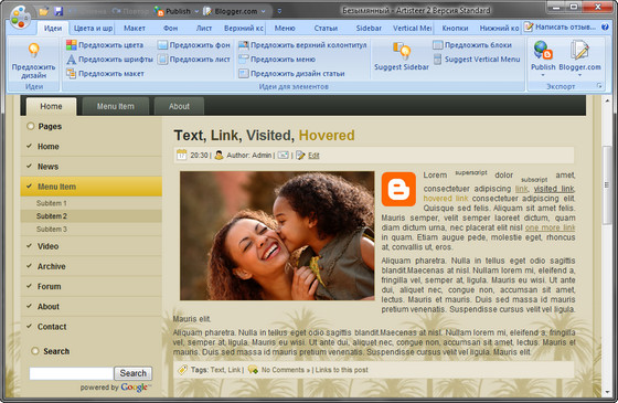 Artisteer - первый и единственный продукт автоматизации веб дизайна, который моментально создает фантастического вида, уникальные шаблоны для СMS Joomla, Drupal, Wordpress, темы для вашего блога или HTML-странички. Проектируйте удивительные темы для Wordpress и создавайте профессиональные вебсайты в считаные минуты.Удобный в использовании.Не требующии знаний Photoshop, CSS, HTML.Экспорт тем в Wordpress,Joomla,Drupal или шаблонов для CMS.