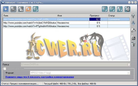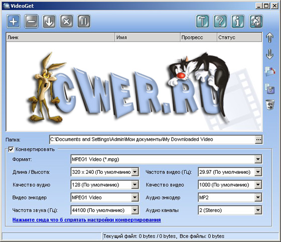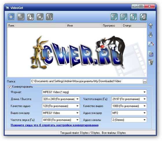 VideoGet - это программа для скачивания видео клипов с больше чем 100+ видео веб-сайтов (YouTube, Yahoo Video, MySpace, VSocial, Metacafe, и много-много других). Многие из этих веб-сайтов держат видео в FLV формате, и большинство людей не знает как проигрывать эти файлы VideoGet также позволит вам конвертировать все видео в множество популярных форматов для более комфортного проигрывания VideoGet поддерживает AVI, MPEG1, MPEG2, WMV, FLV, MP4, 3GP, MP3 форматы, так что вы имеете возможность не только посмотреть видео на своем компьютере, но и переписать его на свой iPod, мобильный телефон или любой другой портативный прибор. Кроме того вы самостоятельно можете задавать настройки конвертации.