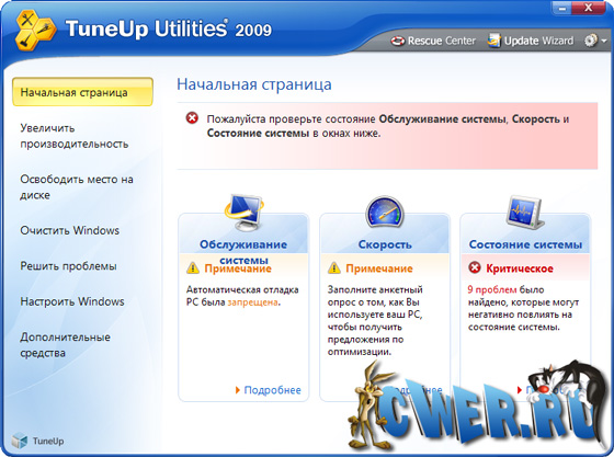 TuneUp Utilities 2009 - компактный пакет системных утилит с мощными возможностями: чистка и исправление ошибок системного реестра, восстановление и безвозвратное удаление данных, оптимизация оперативной памяти, менеджер процессов и автозагрузки, корректное удаление ставшего ненужным ПО, управление сетевыми параметрами, оптимизация интернет-соединения, настройка "скрытых" параметров системы, подробная информация о системе и многое другое.